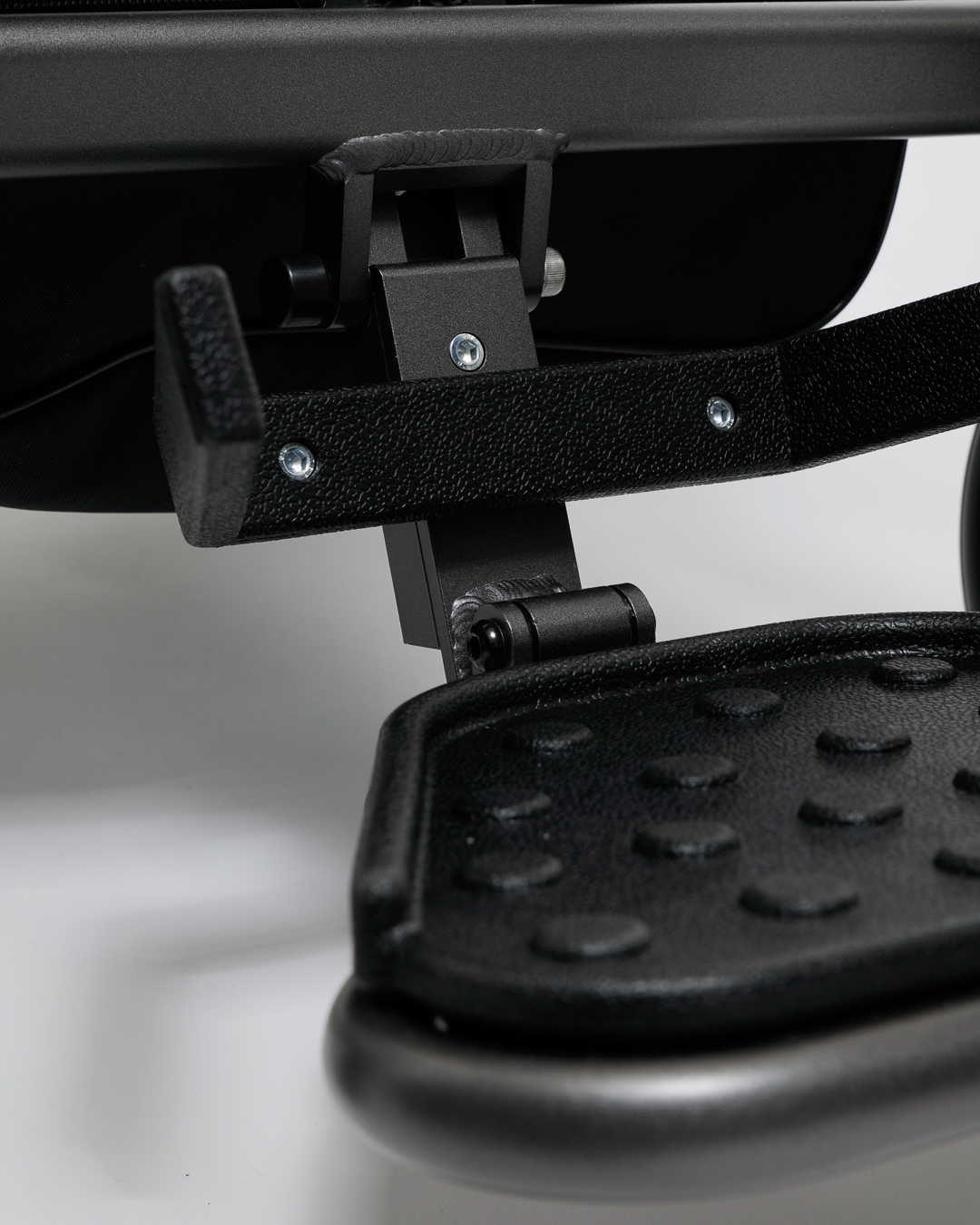 Denne modellen har et smart fotstøtte som kan justeres både vertikalt og horisontalt, og gir maksimal komfort. Designet for bekvemmelighet, kan fotstøtten lett foldes bort, slik at det blir enkelt å komme inn og ut av stolen.