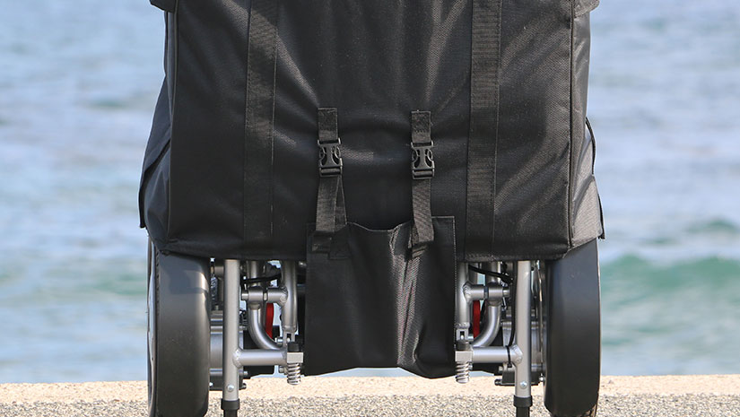 Nederst snøres den sammen med to sterke spenner. Designet gjør at hele bagen kan løftes i håndtakene med stolen inni, uten fare for at den åpnes og stolen faller ut. Dette er spesielt relevant når du sjekker inn Eloflex før du reiser med fly, ettersom flyplasspersonalet ofte løfter Eloflex etter håndtaket når den lastes inn på flyet.