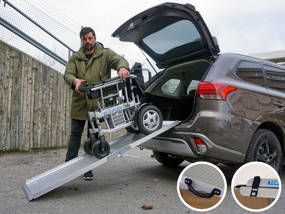 Disse lasterampene passer for alle Eloflex-modeller, så vel som andre rullestolmerker, noe som gjør dem enda mer allsidige. Rampen, som er 38 cm bred og 180 cm lang, kan brettes i to og er derfor bare 95 cm når du laster den inn i bilen. Rampen veier bare 6 kg, er lett å håndtere og tåler en maksimal belastning på 60 kg. Det hjelper å være to personer som laster den inn i bilen.