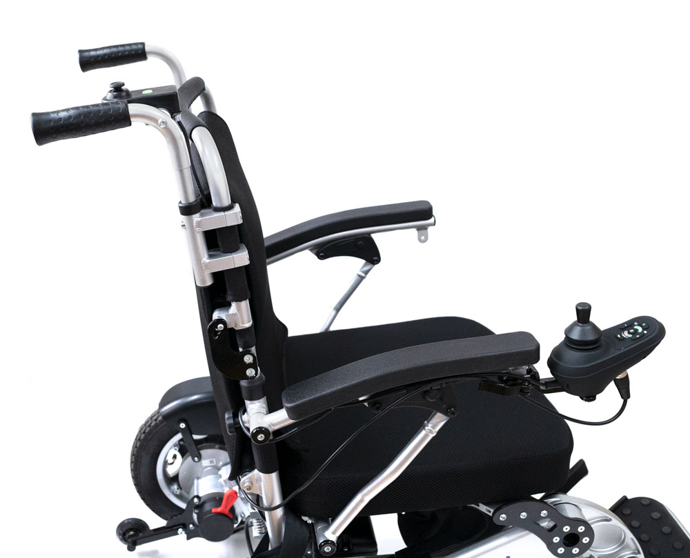 Eloflex Modell A er et sikkert ledsagerstyringssystem med høy presisjon spesielt designet for Eloflex elektriske rullestoler. Når modus for ledsagerkontroll er aktivert, kan personen som går bak den elektriske rullestolen trygt og nøyaktig betjene den. Enten du er ledsaget av en ledsager eller en omsorgsperson, er det enkelt å kontrollere rullestolens bevegelse med en arm og brakett plassert på baksiden av stolen. Armen har en ny joystick, to håndtak og en tommelstyrespak. De to håndtakene lar personen som går bak intuitivt føle stolens bevegelser og betjene tommelstyrespaken med eksepsjonell presisjon.