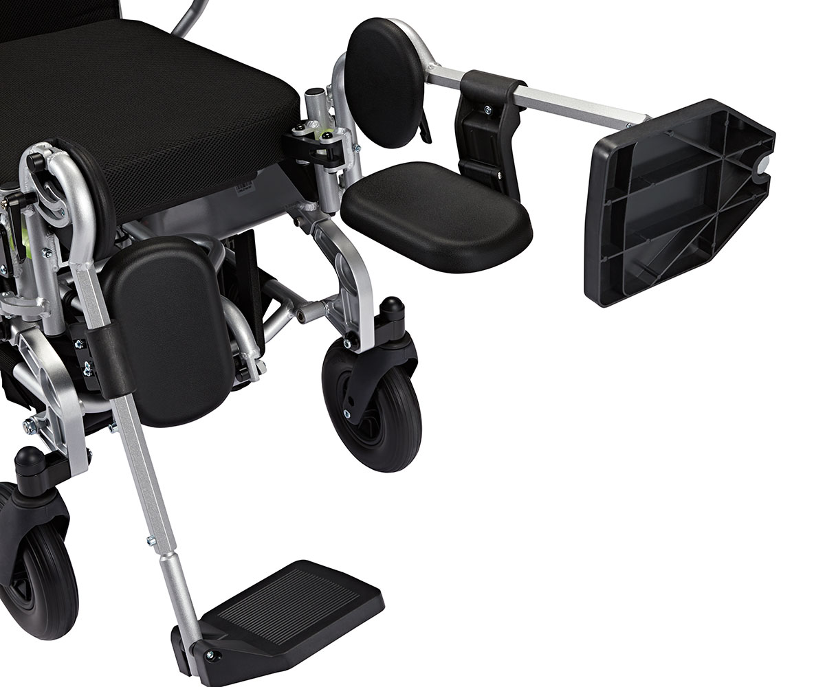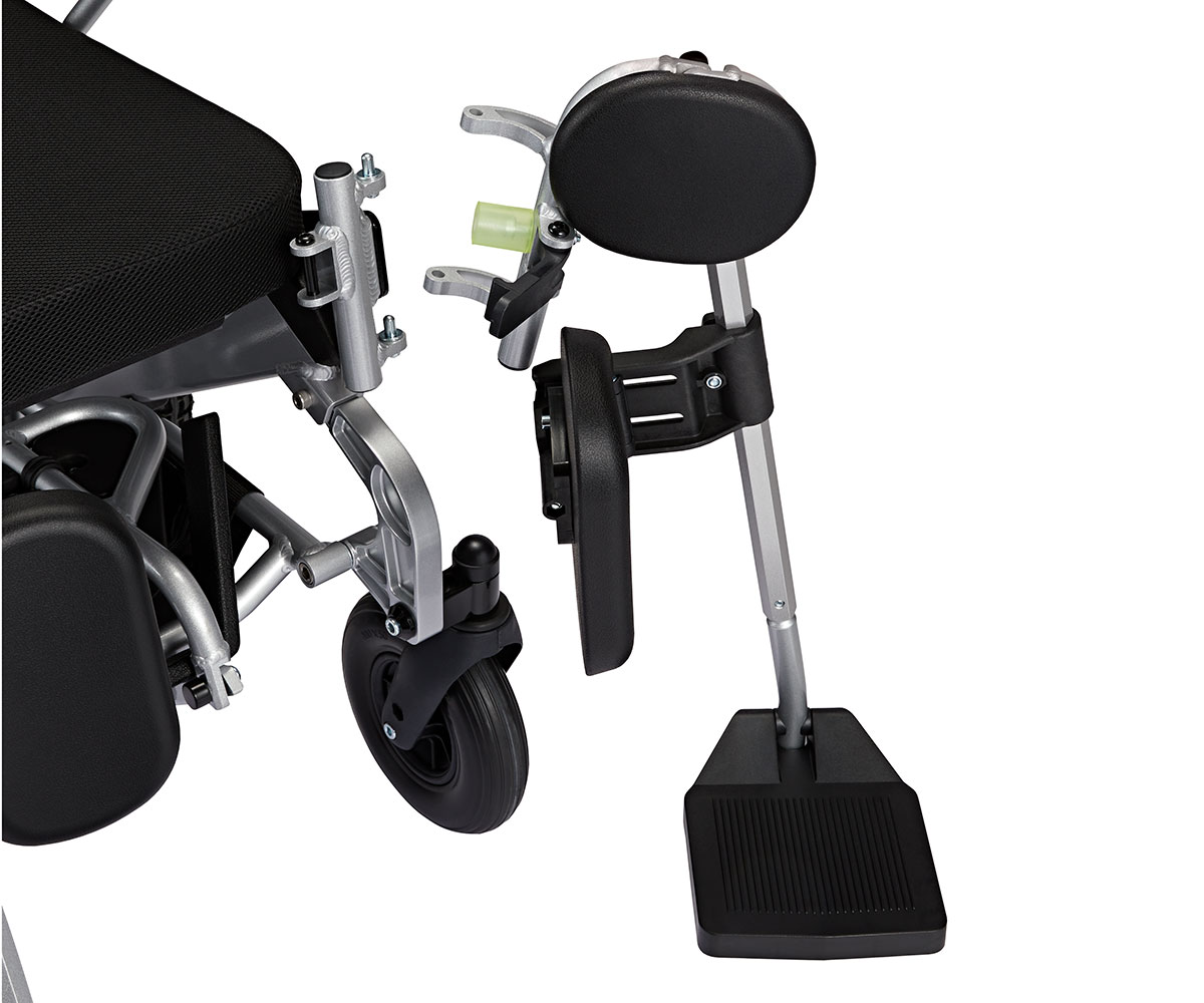 Når du trenger å sette deg ned i eller gå ut av rullestolen, kan du enkelt folde fotstøttene til siden. Dessuten er de lett avtakbare, noe som gjør transporten mer praktisk eller lar deg bytte til Eloflex standard fotplate når du ønsker det.
